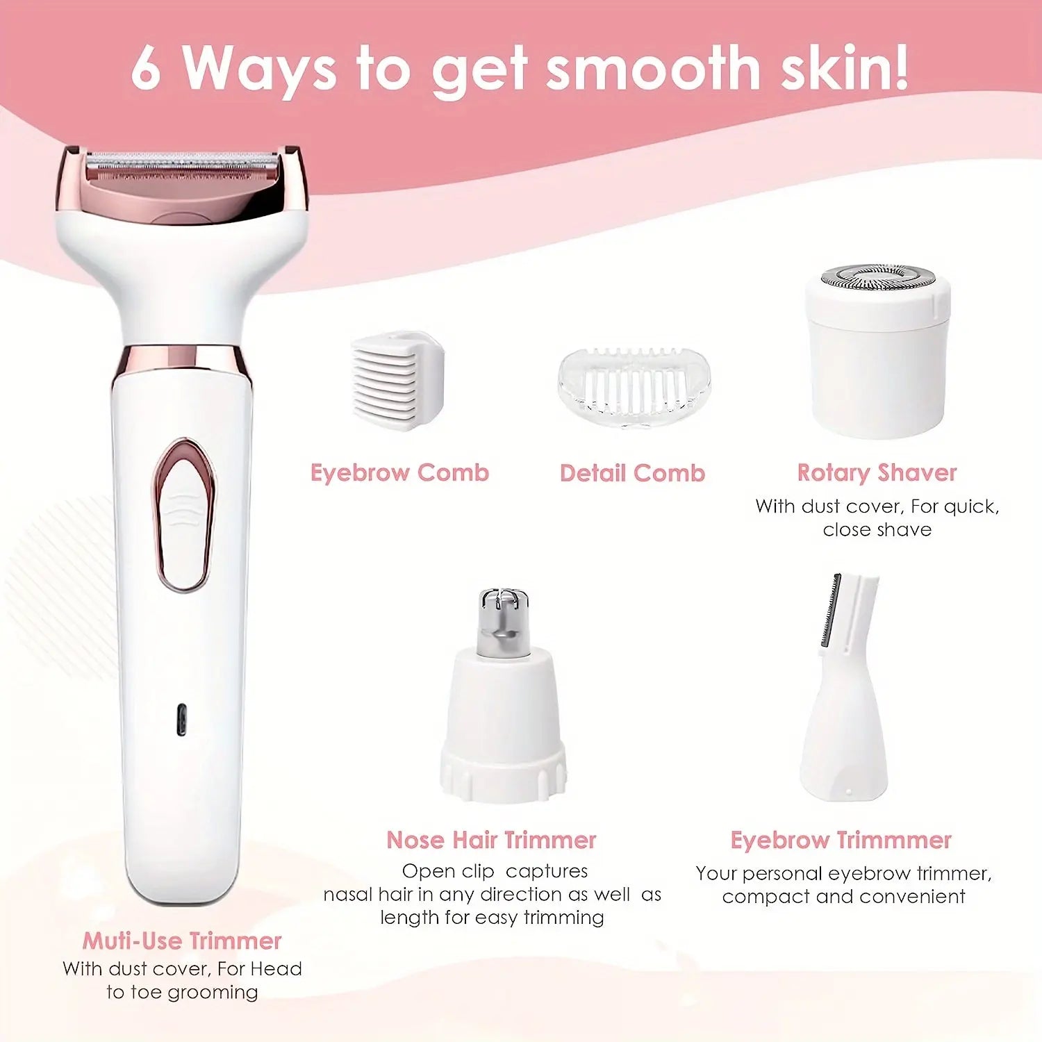 - ✅ VERSATILIDAD 4 EN 1, PARA TU RITMO: Optimiza tu rutina con una solución integral. Los 4 cabezales intercambiables de ElegancePro te brindan una versatilidad sin igual: perfilador de cejas, recortador nasal, depilador facial y cabezal corporal. Un único dispositivo que se adapta a tu exigente agenda, garantizando una imagen pulcra y profesional en todo momento.